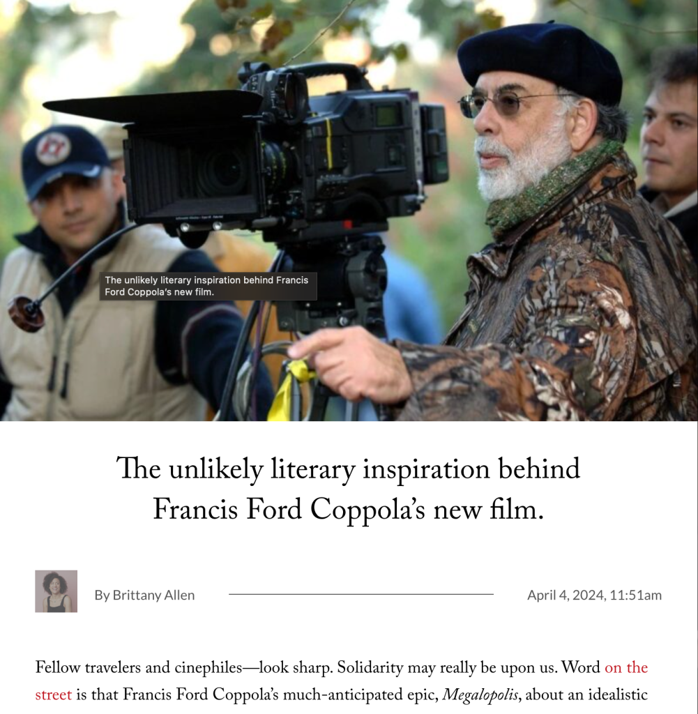 I was already looking forward to Megalopolis, but this article got me super-hyped. He’s taking inspiration from Graeber? YES! I can’t decide if I want it to be a perfect masterpiece, or a big bountiful mess of a movie, either would be great. Francis Ford Coppola is a true art-hero.