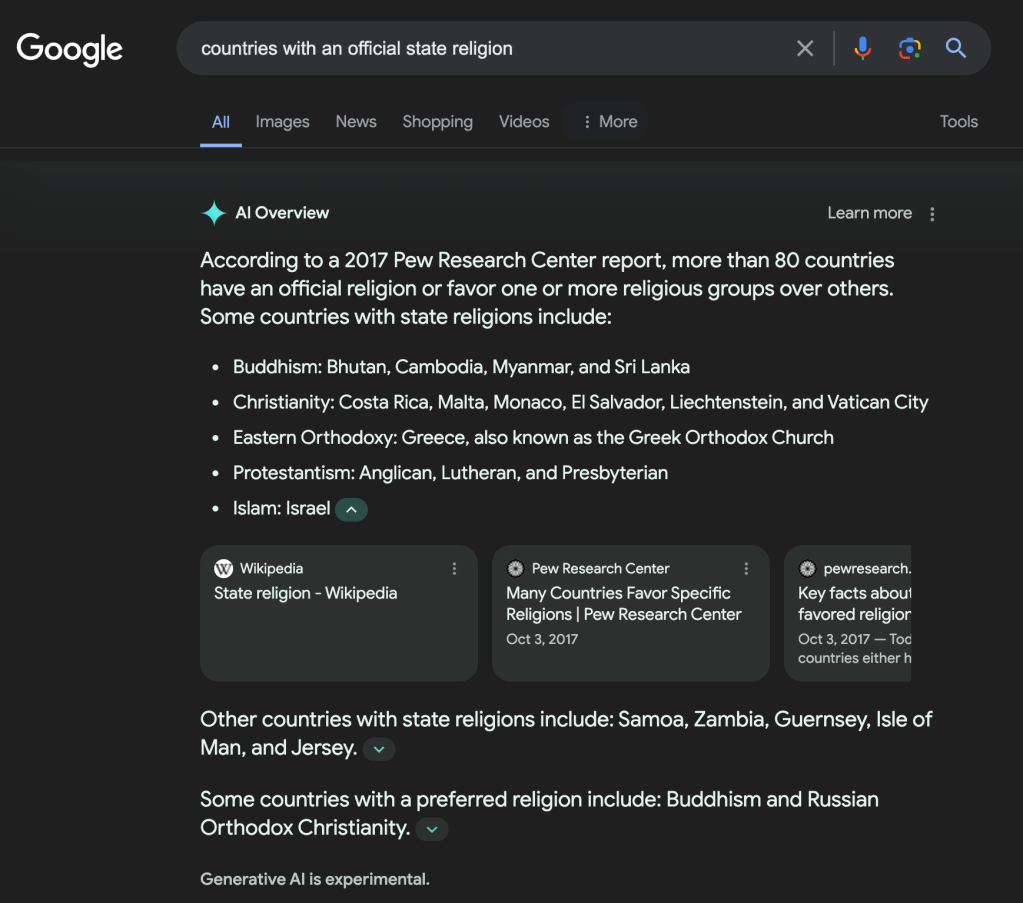 Also, here’s a NEW CONSPIRACY THEORY for ya: AI has been introduced and pushed to slowly make the internet even more useless than it currently is. Check out this result I got when Googling ‘countries with an official state religion’